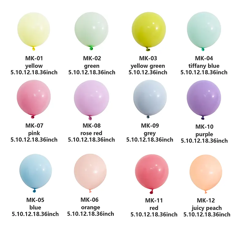 रंगीबेरंगी: प्रगत कलर पेस्ट ब्लेंडिंग तंत्रज्ञानाचा वापर करून, वैज्ञानिकदृष्ट्या मॅकरॉन रंग पुनर्संचयित करा - आकाश निळे, बाळ गुलाबी, मलई पिवळ्या, हलके गवत हिरवे आणि डझनभर इतर मऊ आणि रंगीबेरंगी रंग, बॅचमधील रंग अत्यंत सुसंगत आहे, आपण खरेदी केलेल्या लेटेक्स बलूनसाठी विश्वसनीय गुणवत्ता आश्वासन प्रदान करते.