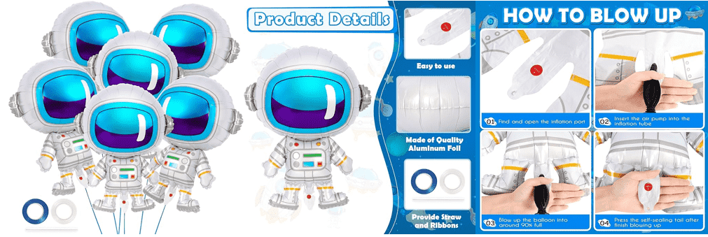 अंतराळवीर फॉइल फुगाथीम म्हणून अंतराळवीरांच्या प्रतिमेसह एक प्रकारचा फुगा आहे, जो सहसा पार्टी सजावट, उत्सव मांडणी आणि इतर प्रसंगांसाठी वापरला जातो. ॲल्युमिनियम फॉइल मटेरिअलपासून बनवलेले, या मटेरियलमध्ये हवेचा घट्टपणा चांगला आहे, फुगलेली स्थिती दीर्घकाळ टिकवून ठेवता येते, रंगीबेरंगी असते आणि कोमेजणे सोपे नसते, सुरक्षित आणि बिनविषारी असते आणि पुन्हा वापरता येते.