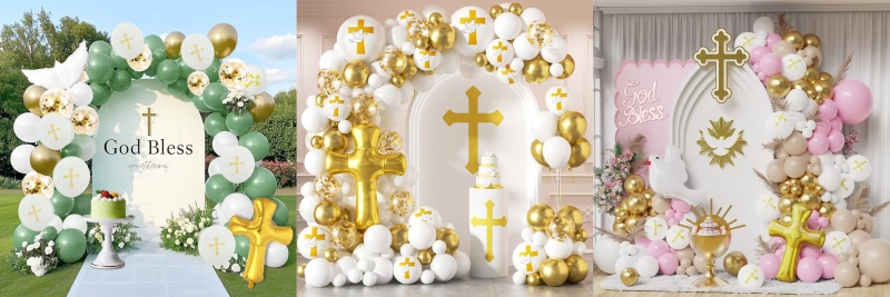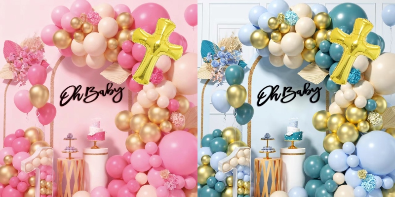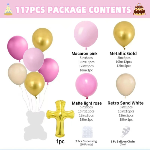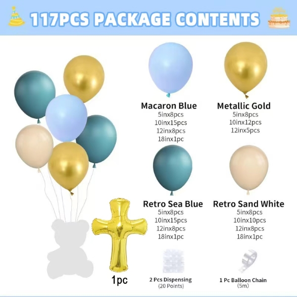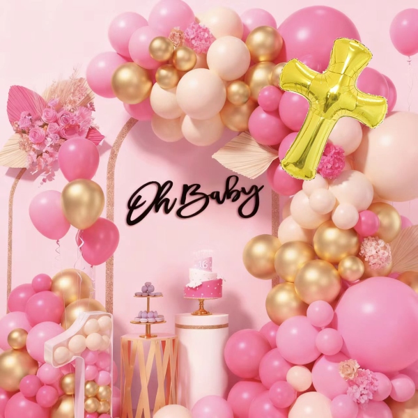 बेबी शॉवर बलून आर्क किटमध्ये दोन शैली आहेत, एक शैली लहान मुलींसाठी आहे आणि एक शैली लहान मुलांसाठी आहे. बेबी गर्ल सेट मॅकरॉन पिंक कलरचा फुगा, मॅट लाइट रोझ कलर बलून, मॅट लाइट स्किन कलर बलून, मेटॅलिक गोल्ड कलर बलून आणि गोल्ड गॉड ब्लेस क्रॉस यांचा बनलेला आहे. बेबी बॉय सेट मॅकरॉन ब्लू कलर बलून, रेट्रो सी ब्ल्यू कलर बलून, मॅट लाइट स्किन कलर बलून, मेटॅलिक गोल्ड कलर बलून आणि गोल्ड गॉड ब्लेस क्रॉस यांचा बनलेला आहे. त्या दोघांमध्ये ग्लू डॉट आणि बलून ट्रिप आहे, तुम्ही त्यांचा वापर संपूर्ण सुंदर माला बनवण्यासाठी करू शकता.