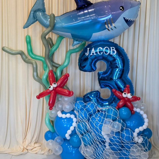 2. फॉइल बलून:बलून गारलँड शार्क फॉइल बलूनसह, हे पॅकेज शार्क, स्टारफिश, जेलीफिश आणि सीहॉर्ससारख्या विविध कार्टून सागरी प्राण्यांसह फॉइल बलूनसह सुसज्ज आहे. याव्यतिरिक्त, आम्ही शार्क फॉइल बलूनसह एक अद्वितीय बलून गारलँड तयार करण्यासाठी आपल्या नमुन्यानुसार आपल्यासाठी सानुकूल फॉइल बलून देखील डिझाइन करू शकतो.
