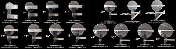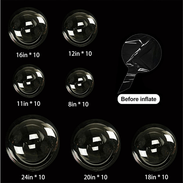 येथे सूचीबद्ध केलेल्या विविध आकारात पारदर्शक बोबो बलून उपलब्ध आहेत. भिन्न आकार भिन्न मॉडेल्स आणि त्यांच्या एकूण फुगलेल्या परिमाणांशी संबंधित आहेत. आपण त्यानुसार आपला आकार सानुकूलित करू शकता.