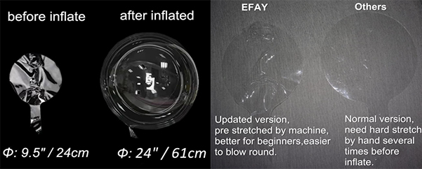 या रुंद-तोंडाच्या बबल बलूनला हाताने ताणण्यासाठी सिंहाचा प्रयत्न करणे आवश्यक आहे. निन ब्रँड विशेषत: शिपिंग करण्यापूर्वी मशीनद्वारे बलून ताणतो, फुगवताना आपला वेळ आणि मेहनत वाचवितो. चांगल्या परिणामासाठी आणि अधिक गोलाकार बलून आकारासाठी आम्ही इलेक्ट्रिक एअर पंप वापरण्याची शिफारस करतो.