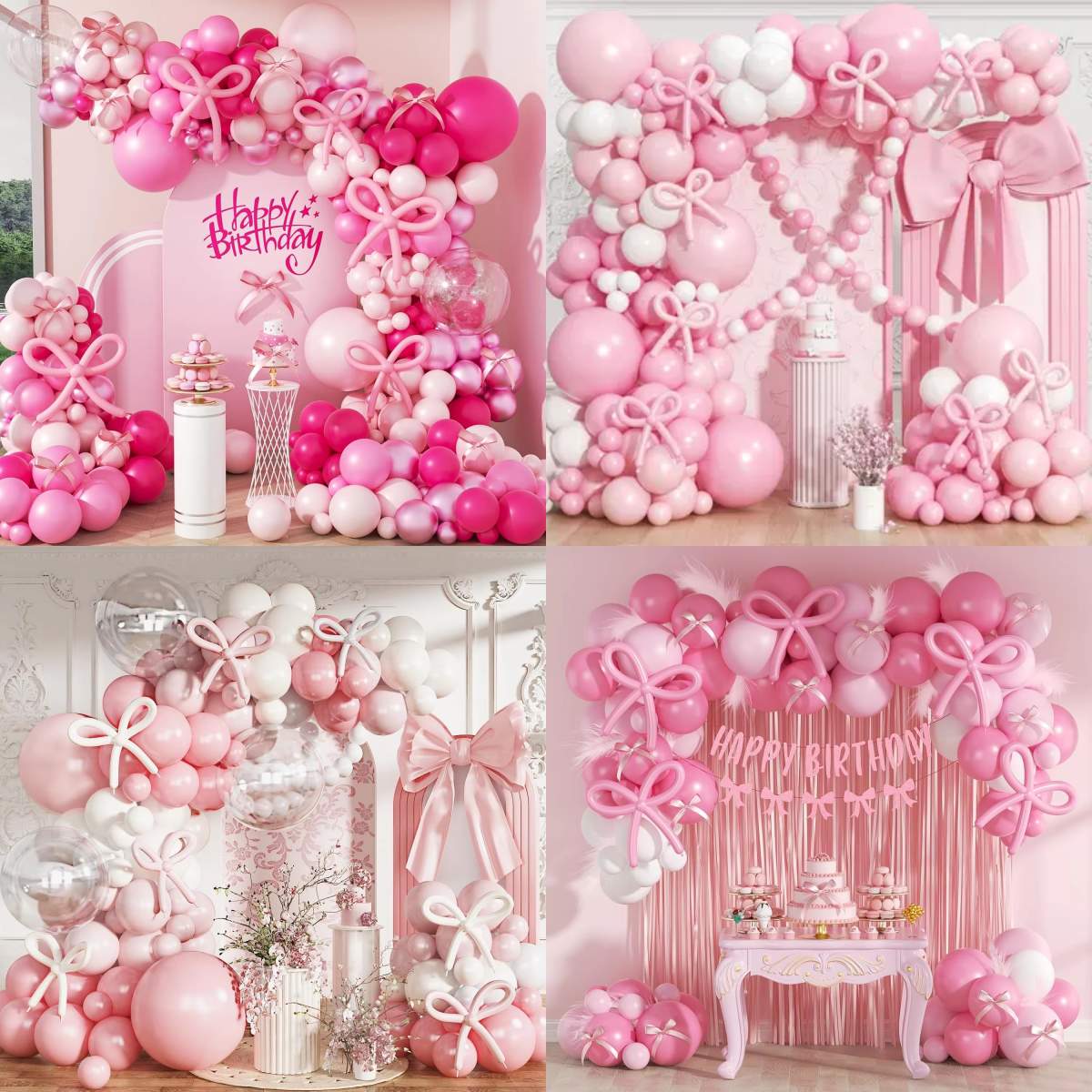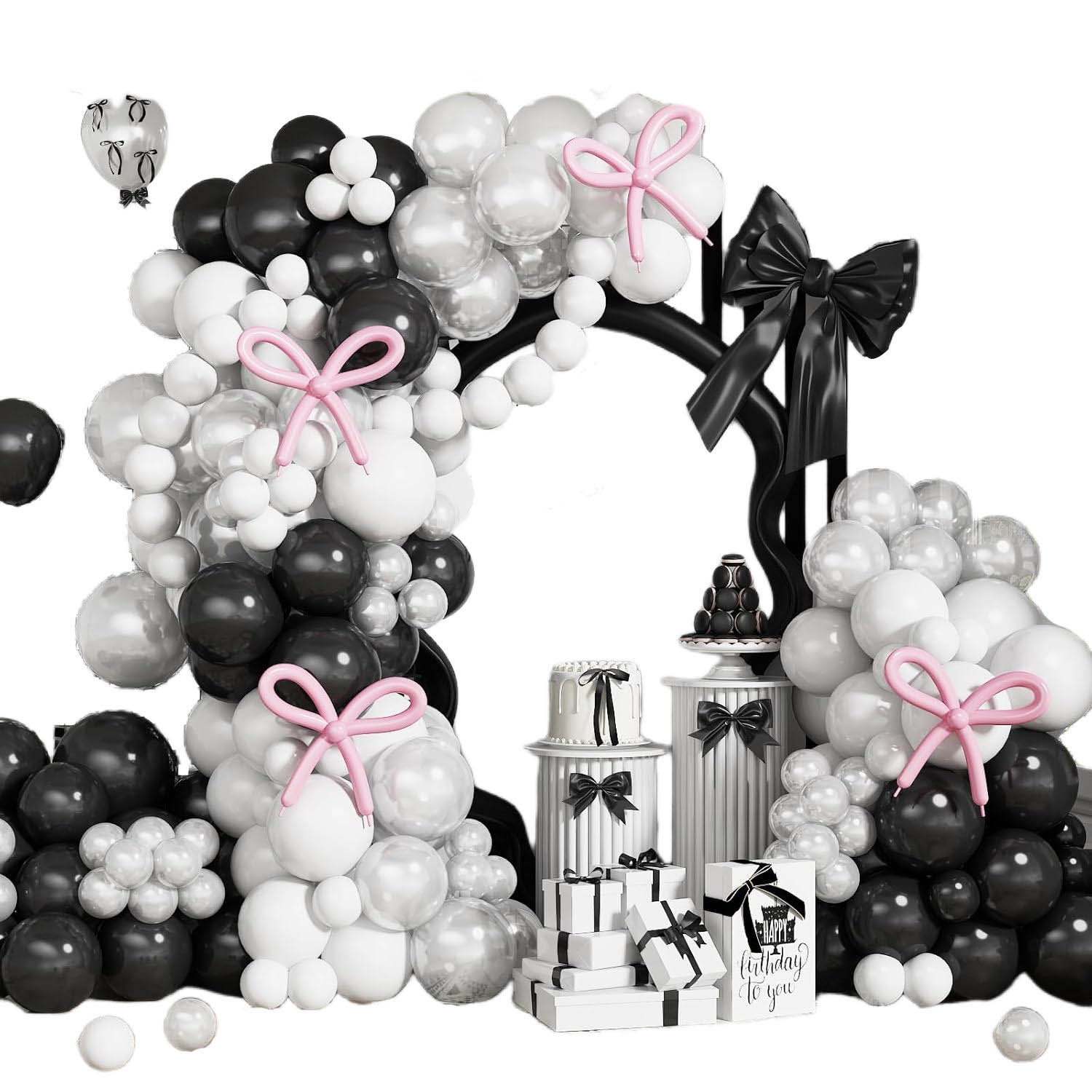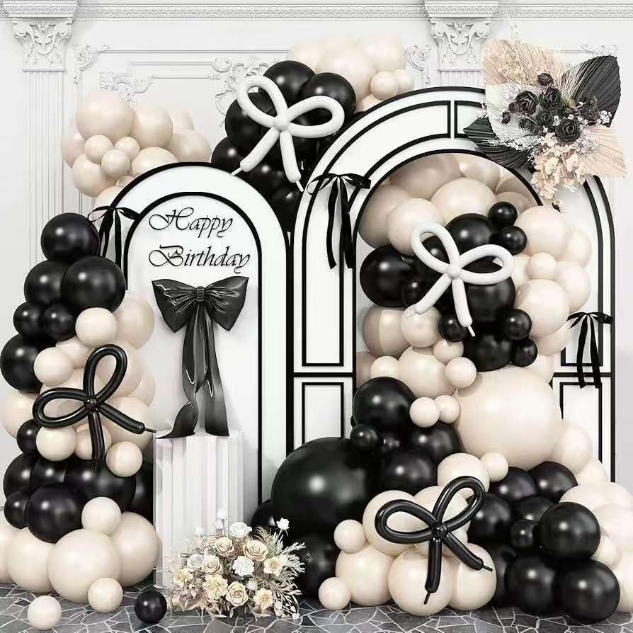 हे धनुष्य बलून आर्क गारलँड सध्या विविध बलून रंगात उपलब्ध आहे. नवीनतम पांढरा आणि ब्लॅक बलून आर्क गारलँड ग्राहकांमध्ये एक लोकप्रिय निवड आहे, कारण हा सर्वात लोकप्रिय रंग आहे. वाढदिवसाच्या शुभेच्छा पार्श्वभूमीसह पांढर्या आणि काळ्या बलून पुष्पहाराच्या कमानीने सुंदर जोड्या सेट केल्या. धनुष्य अॅक्सेंट आपल्या पार्टीमध्ये चमचम आणि मोहकपणाचा स्पर्श जोडून एकूण वाढदिवसाच्या पार्टी बलून आर्क सेटमध्ये वाढ करतात.