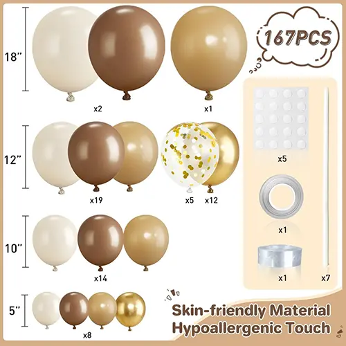 · घटक समाविष्ट: पूर्व-प्रमाणित मानक उंट-रंगाचे फुगे (5 ग्रेडियंट शेड्स असलेले), उच्च-शक्तीचा कमान बेस, व्यावसायिक कनेक्टर, ग्लू-डॉट ग्लोव्हज आणि एक सरलीकृत स्थापना मार्गदर्शक.