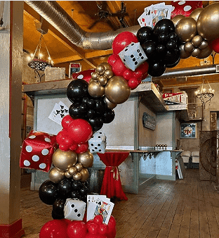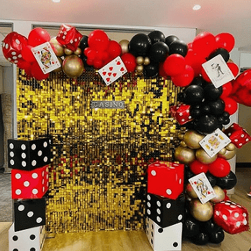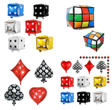 कॅसिनो बलून माला किटमध्ये प्रामुख्याने लेटेक्स फुगे समाविष्ट असतात, ते वेगवेगळ्या आकारात (5 इंच, 10 इंच, 12 इंच आणि 18 इंच) येतात. त्यांच्या रंगांमध्ये सामान्यतः लाल, काळा, सोने इ.चे वर्चस्व असते. किटचा लेयरिंग प्रभाव वाढविण्यासाठी, तुम्ही पारदर्शक लेटेक्स फुगे आणि कॉन्फेटी लेटेक्स फुगे देखील पाहू शकता. किटची थीम म्हणून, कॅसिनो थीम फॉइल फुगे देखील अपरिहार्य आहेत.