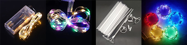 एलईडी लाईट स्ट्रिप्स, प्लॅस्टिक ट्यूब, बलून कप, पंख |