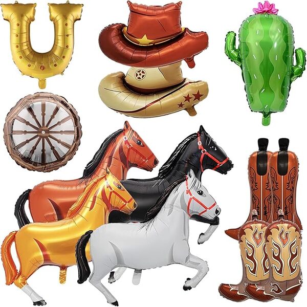 काउबॉय फॉइल फुगे माला सेट:या फुग्याच्या माला सेटचे मुख्य वैशिष्ट्य म्हणजे सरपटणारे घोडे फॉइल फुगे हवेत उडतात. हा प्रभाव तयार करण्यासाठी आपण त्यांना डॉट ग्लू आणि रिबनसह निराकरण करू शकता. याशिवाय, काउबॉय हॅट्स फॉइल फुगे आणि काउबॉय बूट फॉइल फुगे जोडा हे एक चांगले संयोजन असेल. सेटचा मुख्य भाग पाश्चिमात्य शैलीच्या डिझाइनसह लेटेक्स फुग्यांचा बनलेला आहे. तपकिरी, काळा आणि काळ्या आणि पांढऱ्या गाई-रंगाचे, इत्यादींसह वेगवेगळ्या आकाराचे अंदाजे 60-80pcs फुगे आहेत.