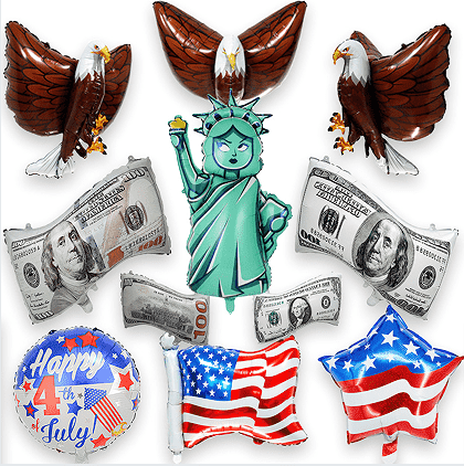 व्यावहारिकता आणि पर्यावरण संरक्षण दोन्ही लक्षात घेऊन ते वारंवार फुगवले जाऊ शकतात. सजावट प्रक्रियेत, आम्ही सुट्टीतील विशेष सजावट घटकांची विविधता जोडली. लेटेक्स फुगे उत्कृष्ट तारेचे पट्टे, पाच-पॉइंटेड तारेचे नमुने आणि इंग्रजी शब्द "हॅपी 4थ ऑफ जुलै" सह छापलेले आहेत. फॉइल फुग्यांचा वापर स्वातंत्र्य दिनाचे क्लासिक आकार तयार करण्यासाठी केला जातो जसे की त्रिमितीय तारेचे पट्टे, टक्कल गरुड आणि क्रमांक "4". सजावटीचा प्रभाव अधिक लक्षवेधी बनवण्यासाठी काही फुग्यांमध्ये सोन्याची पावडर आणि सिक्वीन्स सारख्या फ्लॅश घटक देखील जोडले जातात.