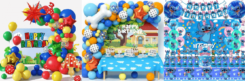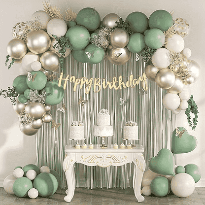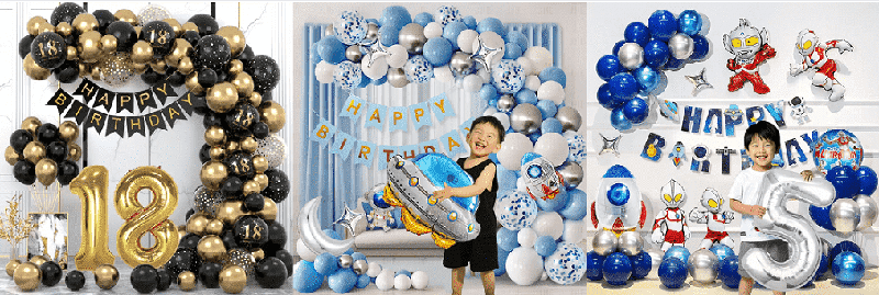 वाढदिवसाच्या शुभेच्छा फुग्याच्या सजावटीच्या या शैलीमध्ये लेटेक्स फुगे, फॉइल फुगे पार्श्वभूमी आणि टेबलक्लॉथ एकत्र करून रंगीत एकीकरणाद्वारे वाढदिवसाच्या पार्टीचे दृश्य तयार केले जाते. पार्श्वभूमी आणि टेबलक्लोथ दृश्याच्या आकारानुसार सानुकूलित केले जाऊ शकतात आणि पार्टी थीम आणि रंग प्रणालीनुसार शैली आणि नमुना सानुकूलित केला जाऊ शकतो.
