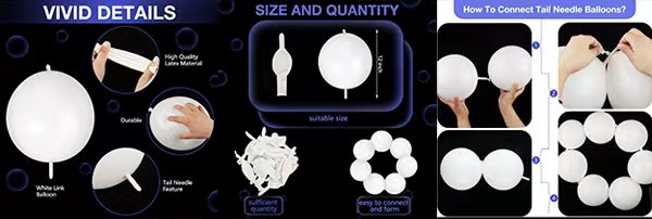वाढदिवसाची पार्टी, लग्न, उत्सव किंवा इतर कोणत्याही प्रसंगी, समान रंग किंवा इतर रंगांचे बलून जोडून, आपण इच्छित मोहक वातावरण तयार करू शकता. ते वर्धापन दिन, हॅलोविन, बेबी वेलकम पार्टीज, ख्रिसमस पार्टीज किंवा इतर कोणत्याही कार्यक्रमासाठी परिपूर्ण सुशोभित करतात. एक अद्वितीय वातावरण तयार करण्यासाठी आणि लक्ष वेधण्यासाठी दुवा बलून सर्व आदर्श निवडी आहेत.