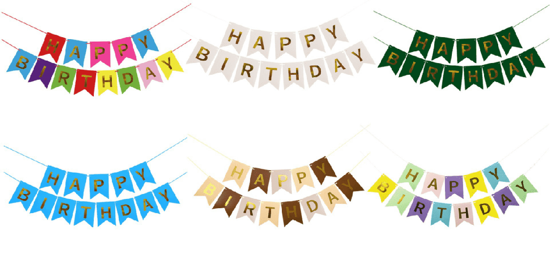 नियमित मॉडेल हॅप्पी बर्थडे इंग्लिश, जुळणारे फुगे, केक, रिबन आणि साधे फॉन्ट, जोडलेले फॉन्ट इत्यादींसह इतर नमुने छापलेले आहेत. रंग मुख्यतः चमकदार लाल, पिवळे आणि गुलाबी आहेत, जे सर्व वयोगटातील वाढदिवसाच्या पार्टीसाठी योग्य आहेत.