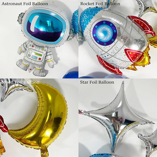 फॉइल फुग्यांमध्ये अंतराळवीर, रॉकेट, फ्लाइंग सॉसर आणि इतर शैली आहेत, जे या मालामध्ये खूप स्वारस्य आणि वास्तविकता जोडतात.