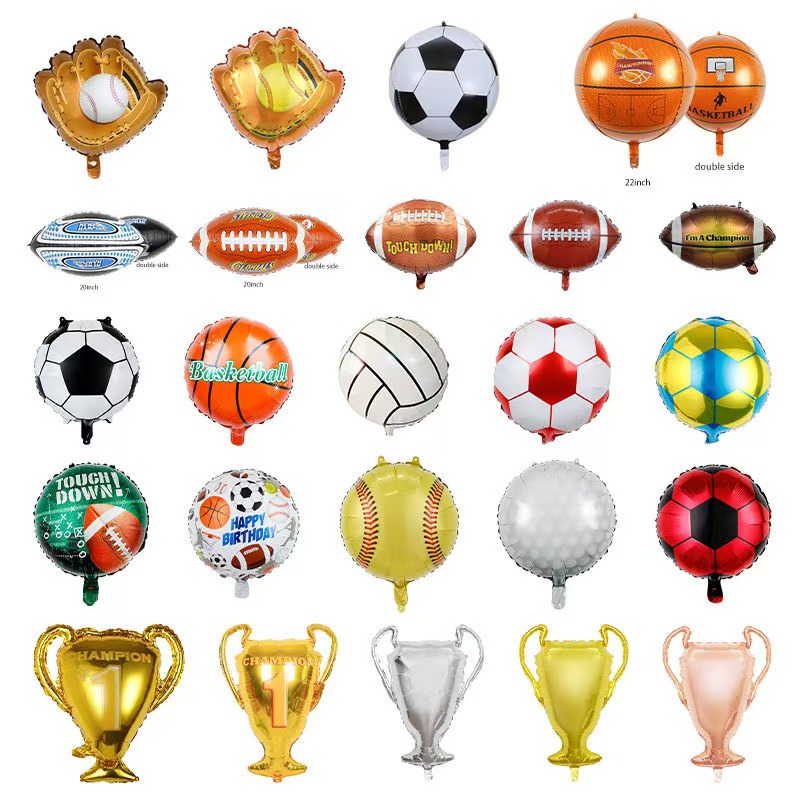 डिझाइनमध्ये क्रीडा उपकरणांचे मॉडेलिंग, बास्केटबॉल, फुटबॉल, डंबेल, ट्रॉफी, क्रीडा आकृत्यांचे छायचित्र, "विन", "गोल" आणि "चॅम्पियन" आणि इतर प्रोत्साहन पत्रे समाविष्ट आहेत. एका मोठ्या आकाराच्या (18-36 इंच) फुग्याला क्लिष्ट जुळणीची आवश्यकता नसते आणि क्रियाकलापाच्या मध्यभागी किंवा प्रवेशद्वारावर टांगल्यावर तो दृश्य फोकस बनू शकतो. मोठ्या प्रमाणातील कार्यक्रमांसाठी उत्साह दाखवणे, मैदानी क्रीडा क्रियाकलाप आणि कॅम्पस स्पोर्ट्स गेम्स, दृश्याचा उत्साह त्वरित प्रज्वलित करणे यासारख्या दृश्यांसाठी हे विशेषतः योग्य आहे.