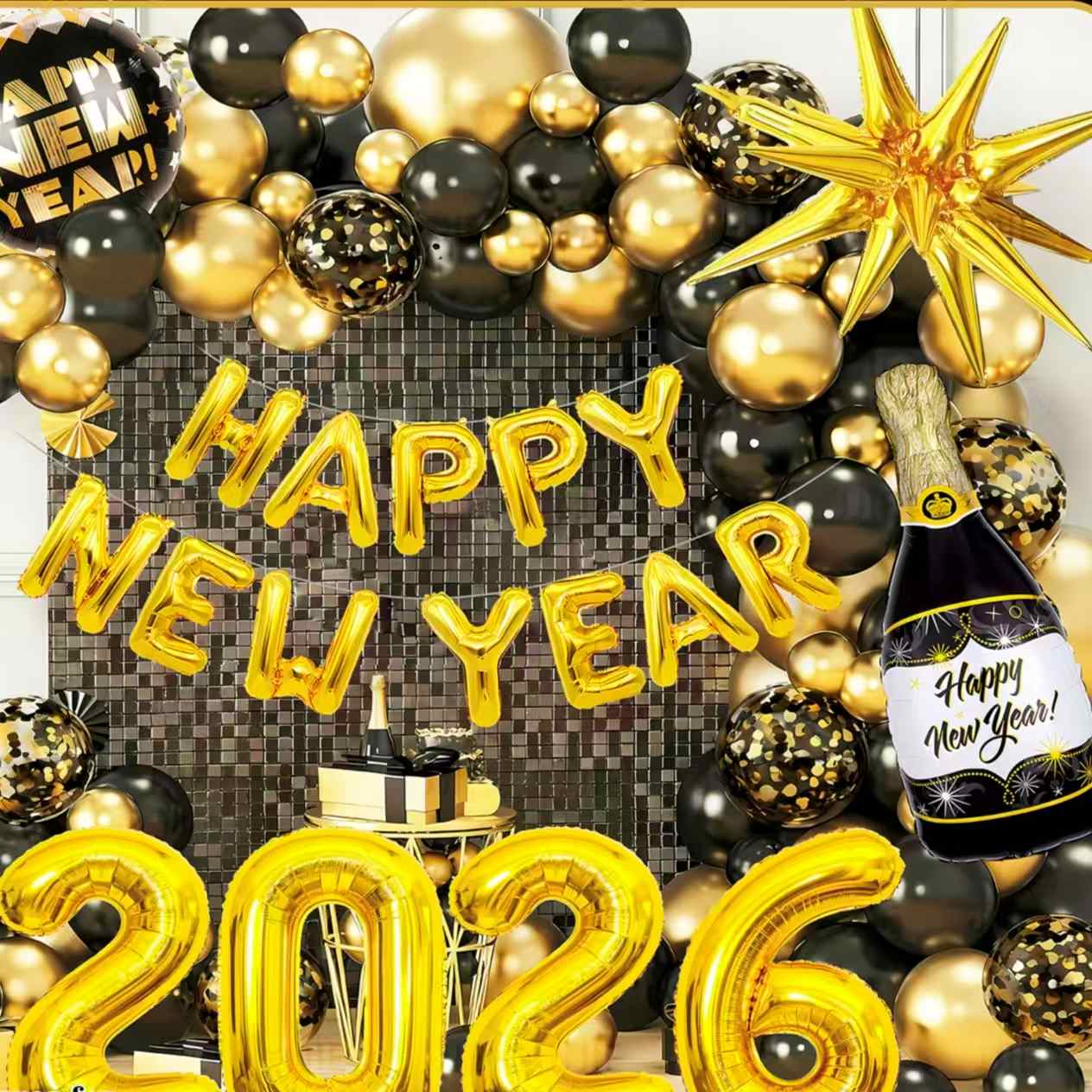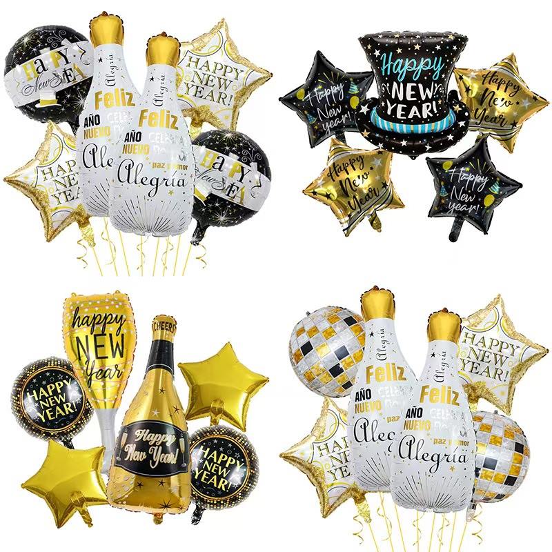 नवीन वर्षाच्या थीम असलेल्या सेटबद्दल विचार करा. त्यात शॅम्पेनच्या बाटल्यांसारखे दिसणारे फॉइल फुगे आहेत. यामध्ये "2026" क्रमांकाचे फुगे, तारा सजावटीचे फुगे आणि बरेच काही समाविष्ट आहे. मुख्य रंग काळे-सोने किंवा सोने-पांढरे आहेत. हे नवीन वर्षाच्या उत्सवाच्या आनंदाने भरलेले आहे. हे सहजपणे विलासी आणि औपचारिक नवीन वर्षाच्या पार्टीचे दृश्य बनवू शकते.