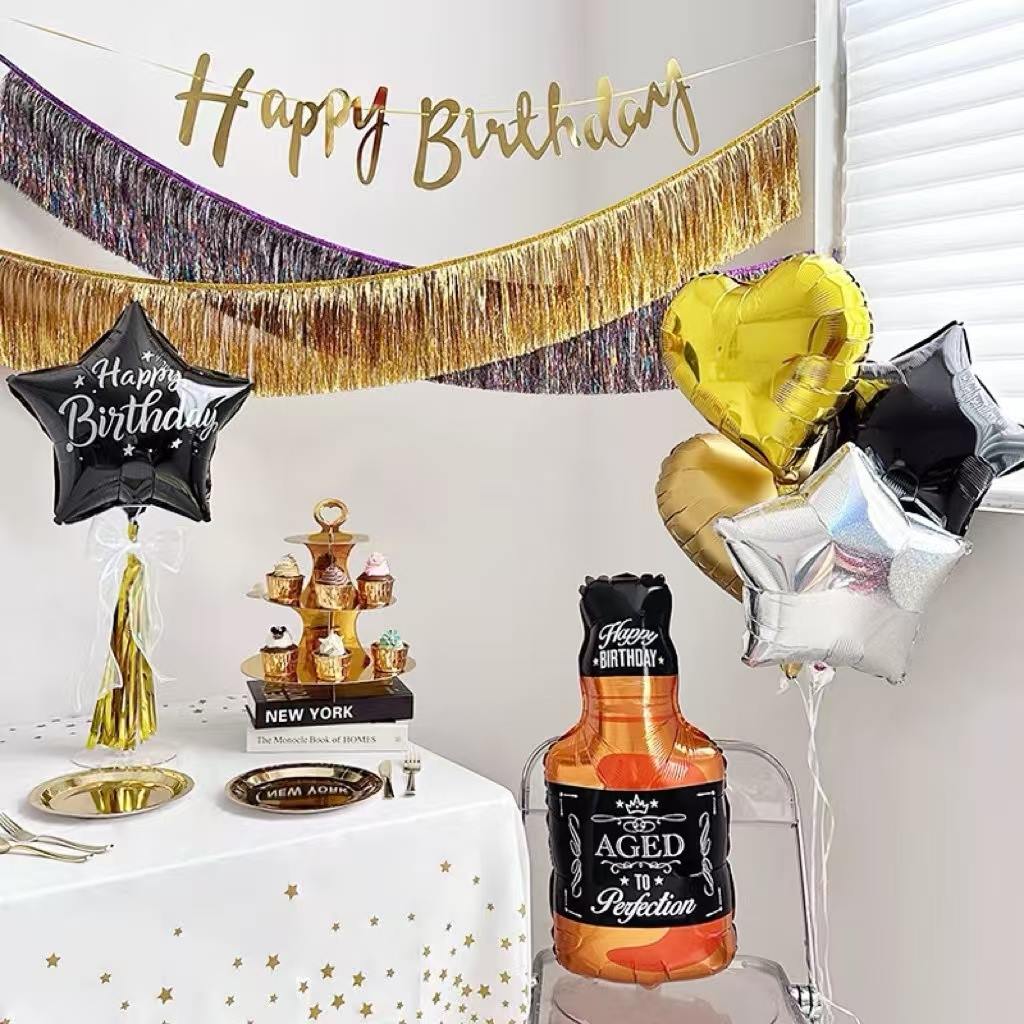 वाढदिवसाची थीम असलेला सेट देखील आहे. गुलाबी आणि गोंडस वाईन बाटलीचे फुगे हृदयाच्या आकाराचे फॉइल फुगे आणि "हॅपी बर्थडे" लेटर फुग्यांसह डिझाइन केलेले आहेत आणि गुलाब सोनेरी रंग अतिशय रोमँटिक आणि उबदार आहे. हे वाढदिवसाच्या पार्टीला एक गोड भावना जोडते.