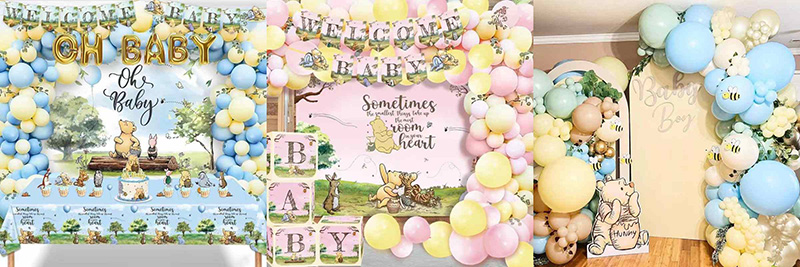 शैली क्लासिक विनी द पूह आयपीवर केंद्रित आहे. हे अनेक गोंडस मित्रांच्या प्रतिमांचे मिश्रण करते. या मित्रांमध्ये टायगर आणि पिगलेटचा समावेश आहे. हे ताज्या मॅकरॉन रंगांमध्ये फुग्यांसह जाते. रंग मऊ निळा, गुलाबी, पिवळा, हिरवा आणि असेच आहेत. हे लहान मुलांच्या पार्टीसाठी चांगले आहे. हे लहान मुलींच्या पार्टीसाठी देखील चांगले आहे. आपण फिट रंगाची शैली शोधू शकता. उदाहरणार्थ, निळी मालिका मुलांची सनी चैतन्य दर्शवते. गुलाबी मालिका मुलींच्या गोडवा आणि गोंडसपणाने परिपूर्ण आहे.